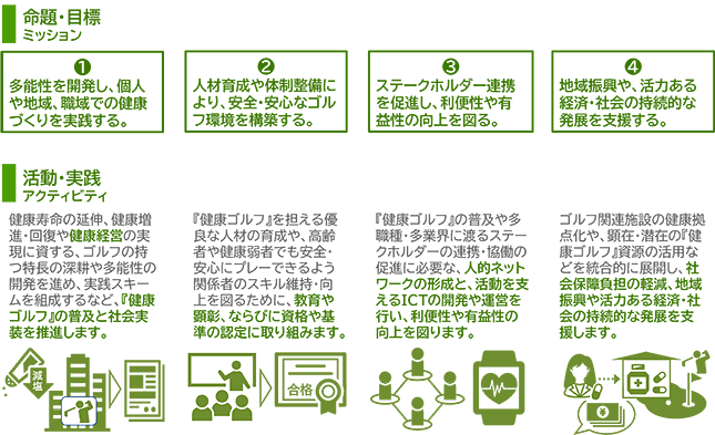 当法人の目的は、「健康ゴルフ」の社会実装を推進し、健康寿命の延伸、並びにゴルフ界と多業界との共創による安全・安心で豊かな社会を実現することです。